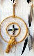 Sioux legends speak to us of the dreamcatcher. It is believed that each carefully woven web will catch your dreams in the night air. The bad spirit dreams will become entangled in the web and disappear in the new day. The good spirit dreams will always find their way through the center opening, and will gently float down the sacred feather to bless the dreamer with peaceful dreams. This dream catcher captures the beauty of this sacred legend.
